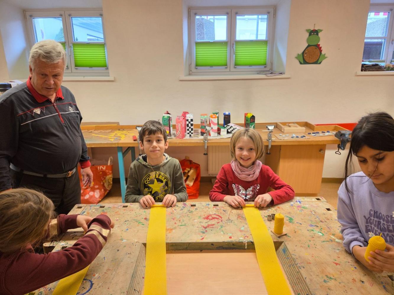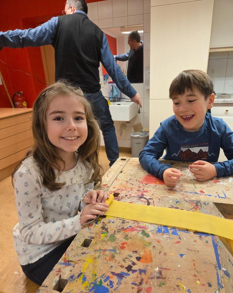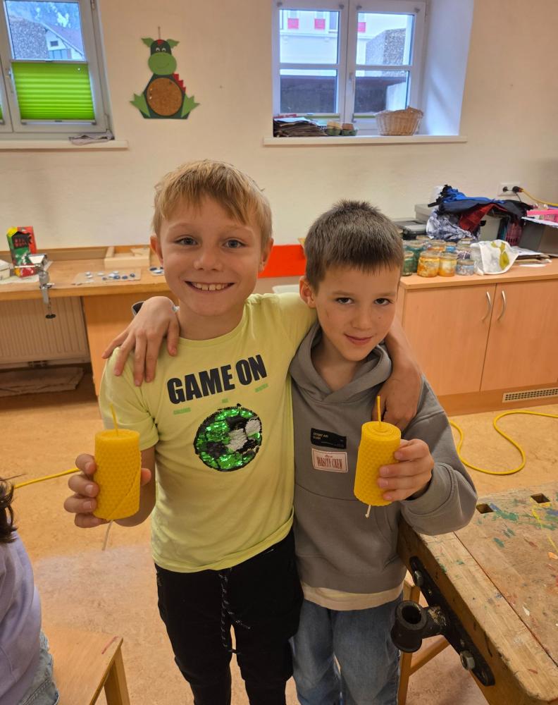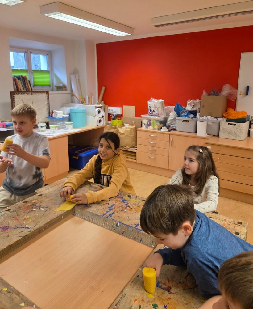 Bienenwachskerzen zur Adventzeit von VS Nassereith 28. November 2025 VSN kreativ 3a 3b Xmas Fein - Christian, Oswald und Otto vom Imkerverein stellen sich bei uns ein!Mit ihren mitgebrachten Bienenwachsplatten (Vielen Dank dafür!) und dem richtigen Dreh entstehen "im Handumdrehen" handgefertigte Kerzen.Wunderbar, wie das reine Bienenwachs duftet, gerade richtig zur beginnenden Adventzeit.