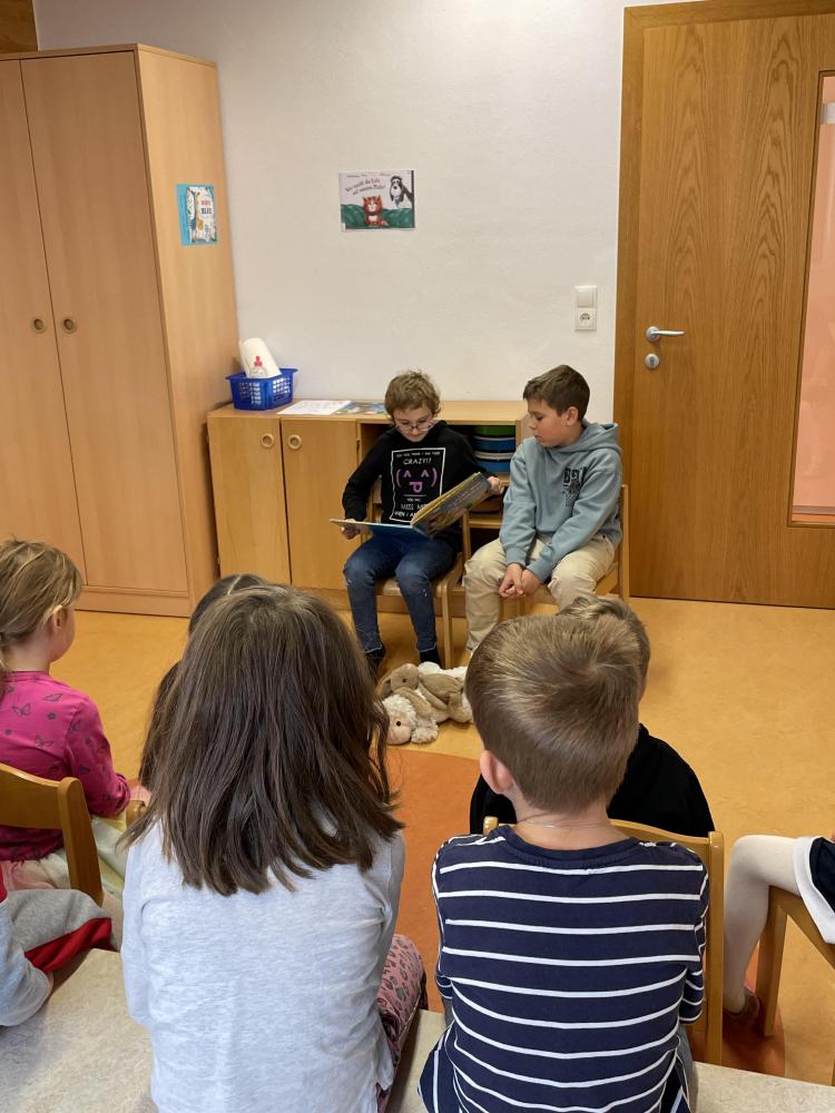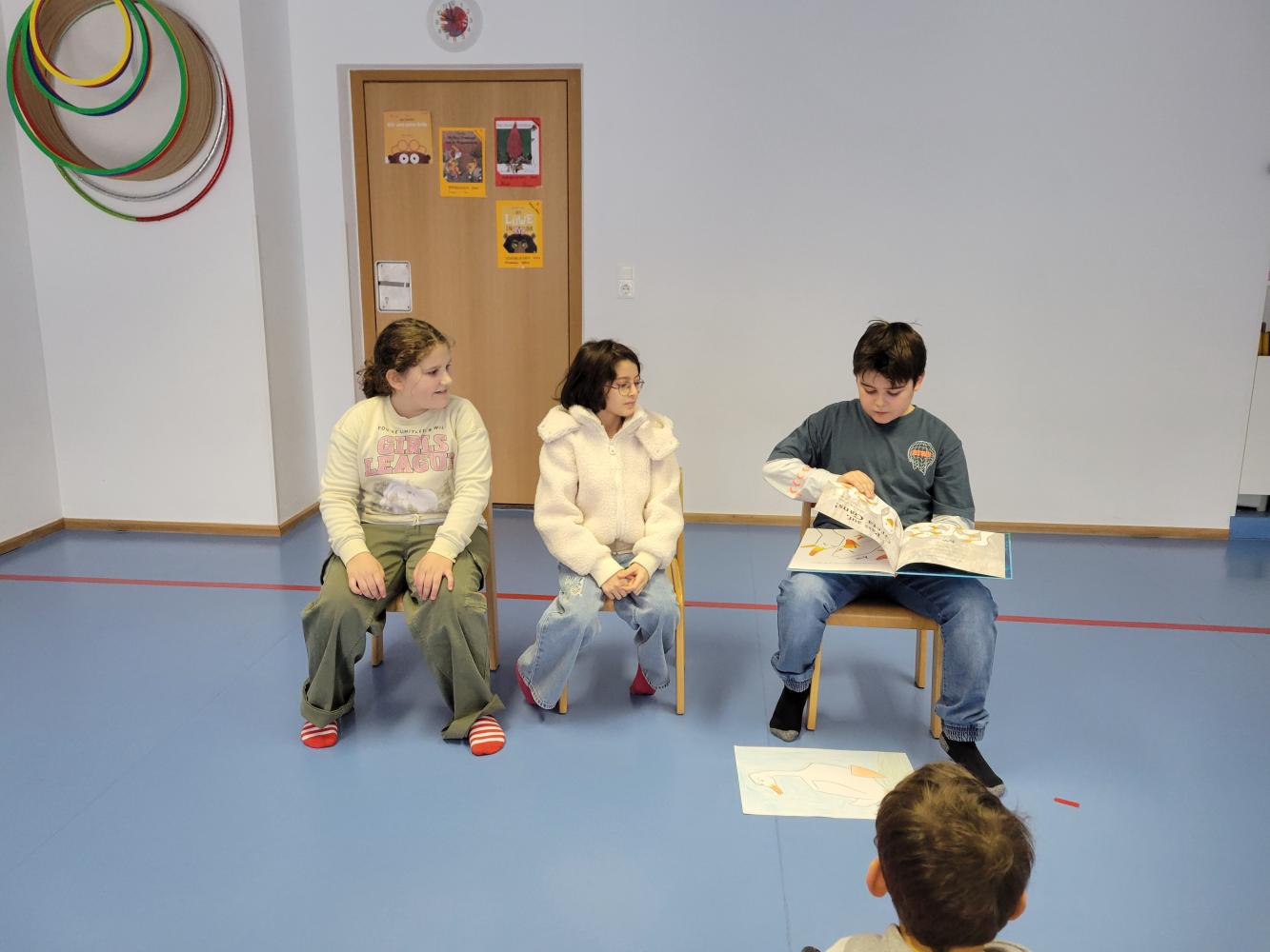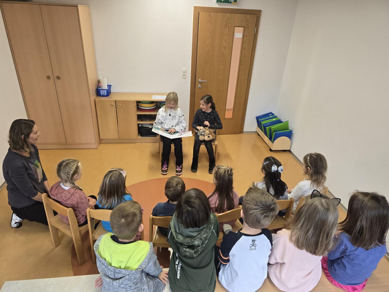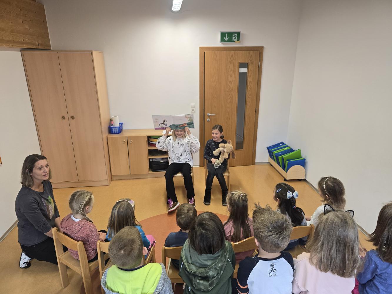 Immer dienstags besuchen unsere Dritterler in 2er-Leseteams den Kindergarten. Dort präsentieren sie den Kindern jeweils ein Bilderbuch und lesen es der gespannten Zuhörerschaft vor.