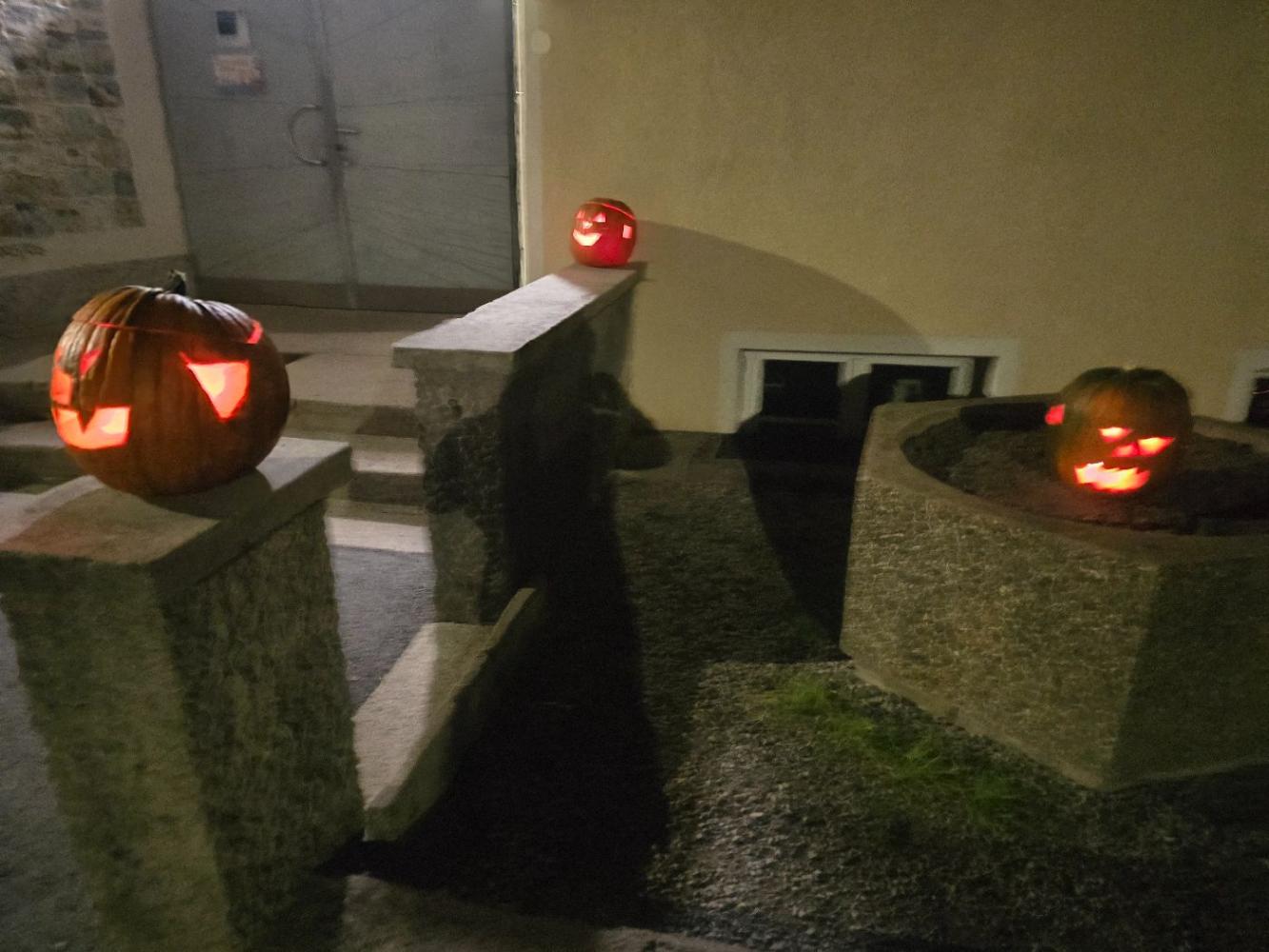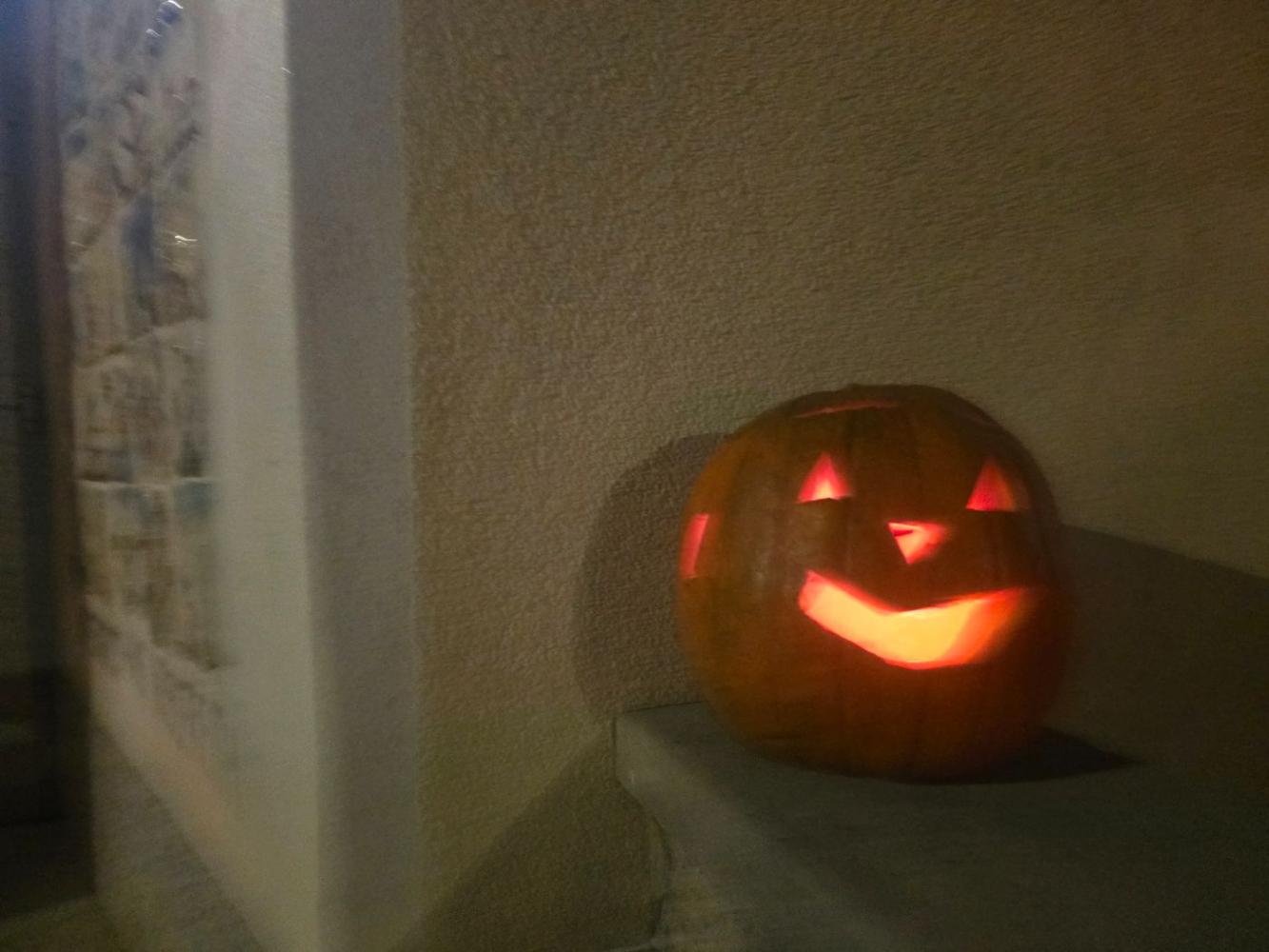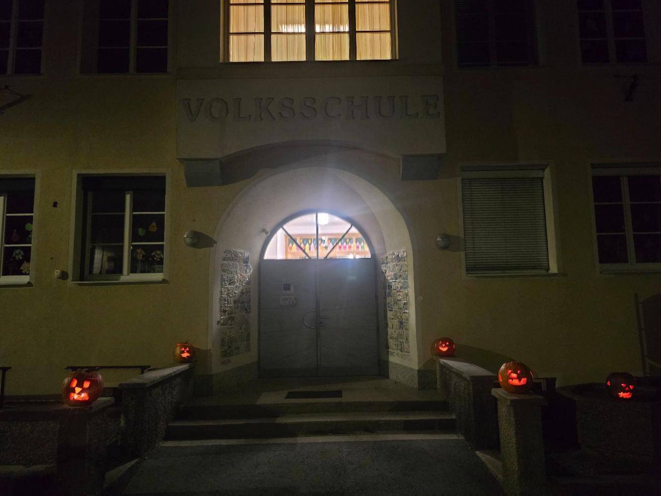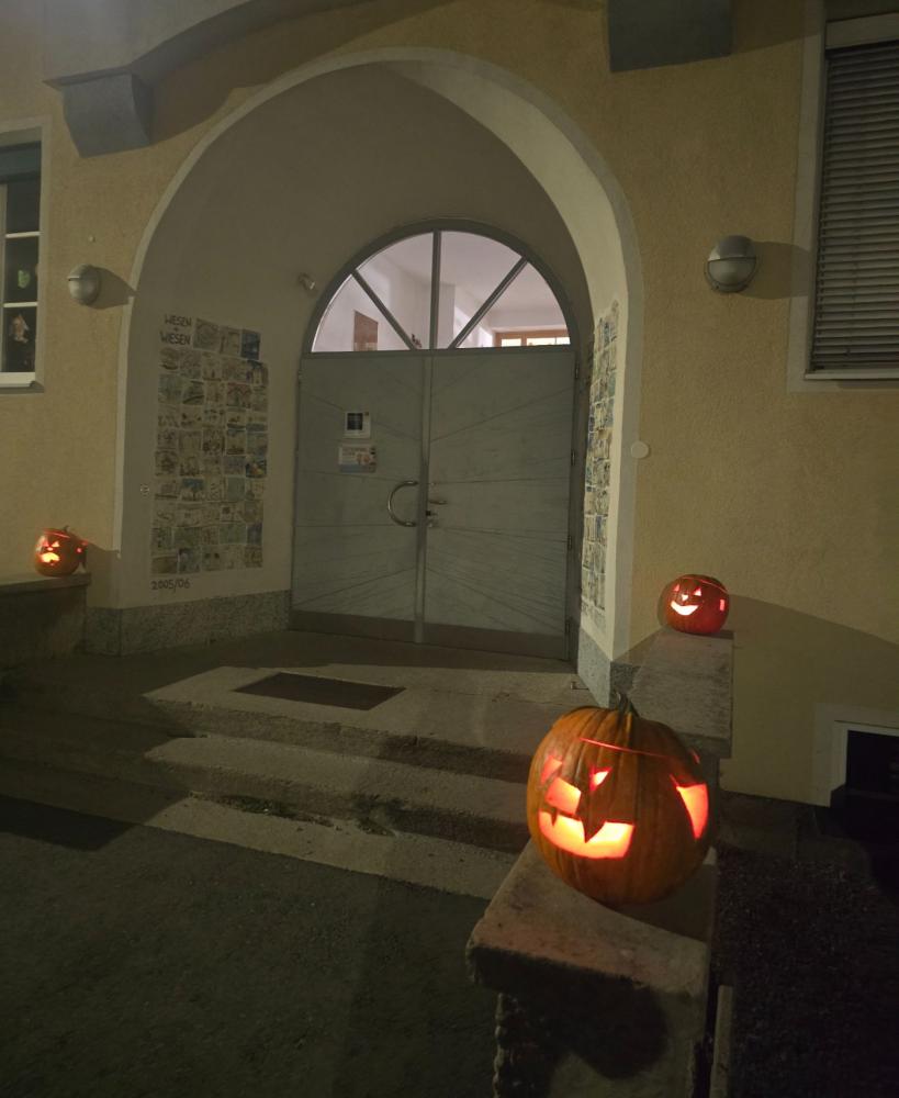 Das Schultor haben abends leuchtende Kürbisköpfe bewacht - die haben offensichtlich einigen Mitmenschen so gut gefallen, dass sie sogleich mitgenommen bzw. "gefladert" wurden...