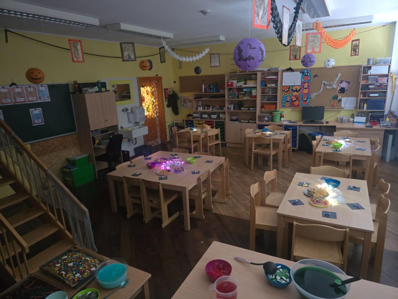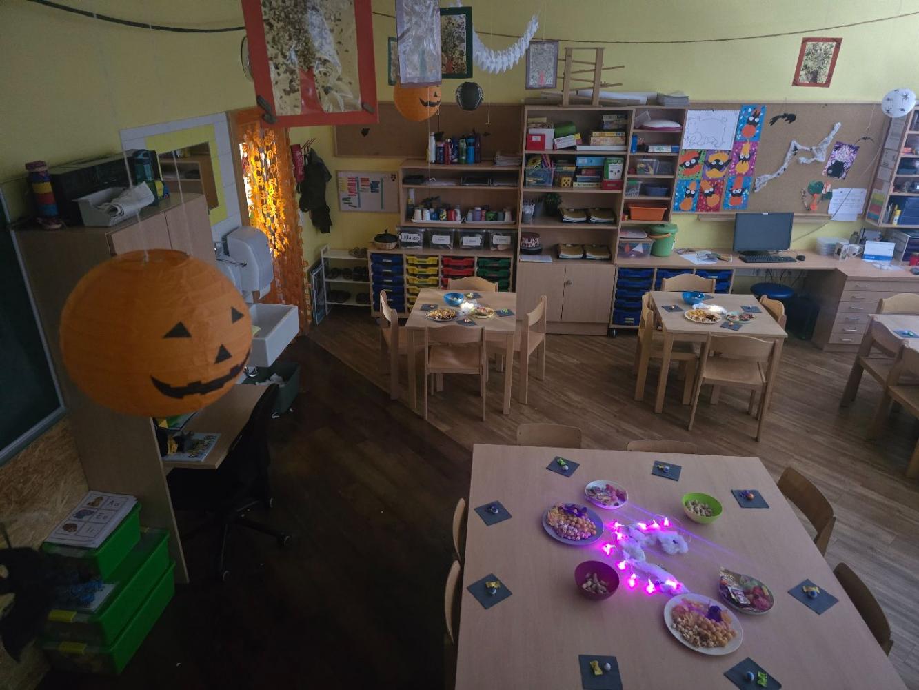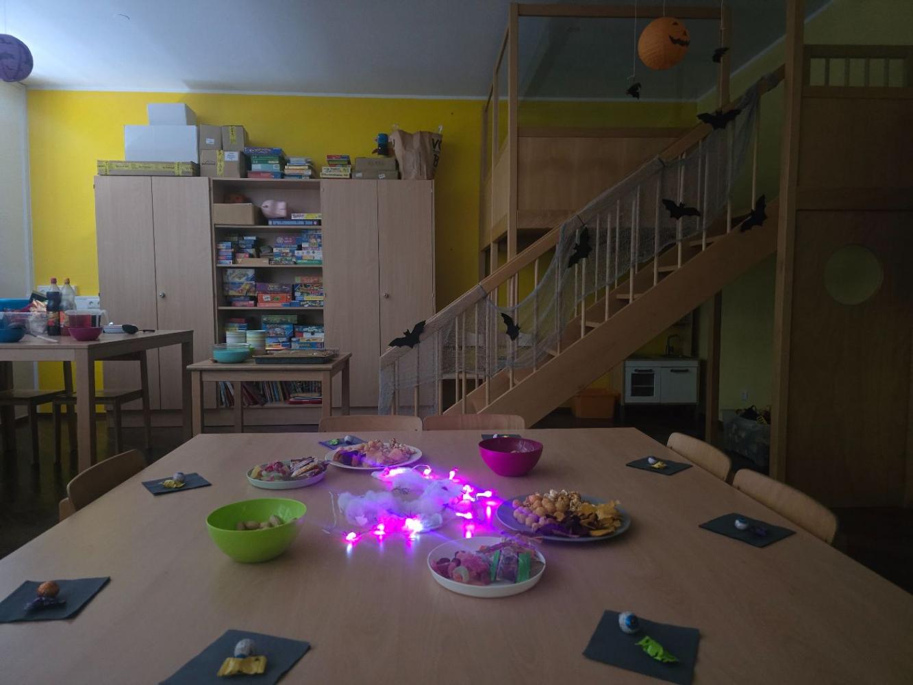Aus dem Aufenthaltsraum wird ein düsterer "Halloween-Party-Raum", in dem u.a. Froschsuppe und Spinnenblut serviert wird. Unseren Kindern schaudert´s und schmeckt´s!