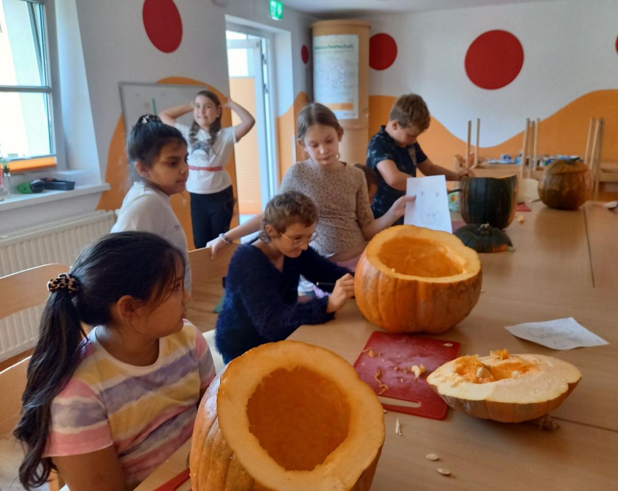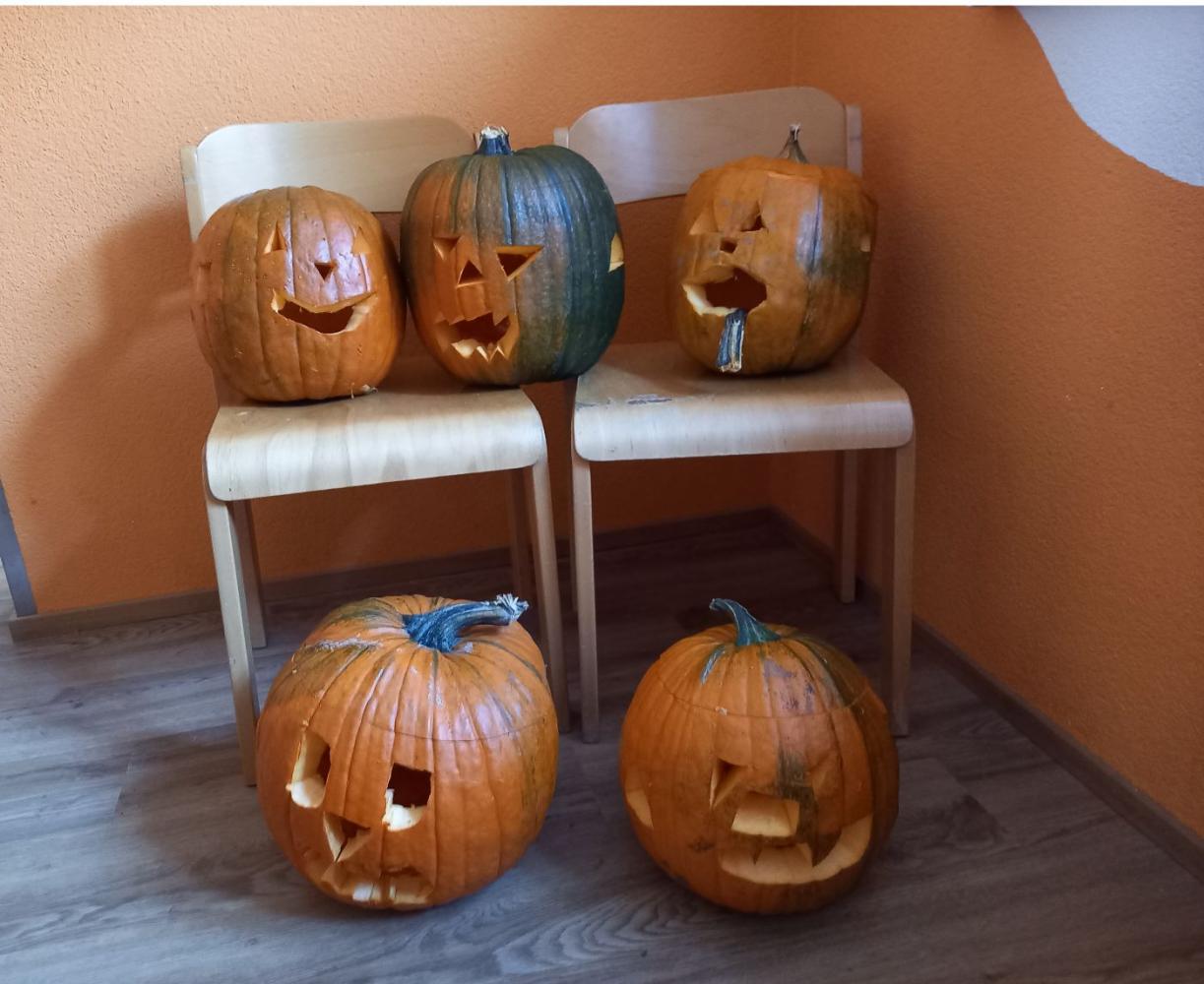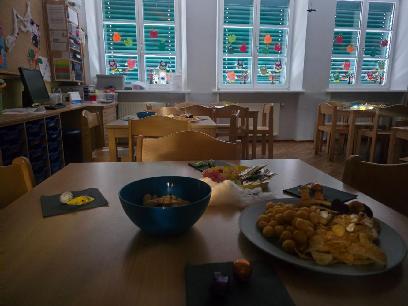 Aus dem Aufenthaltsraum wird ein düsterer "Halloween-Party-Raum", in dem u.a. Froschsuppe und Spinnenblut serviert wird. Unseren Kindern schaudert´s und schmeckt´s!