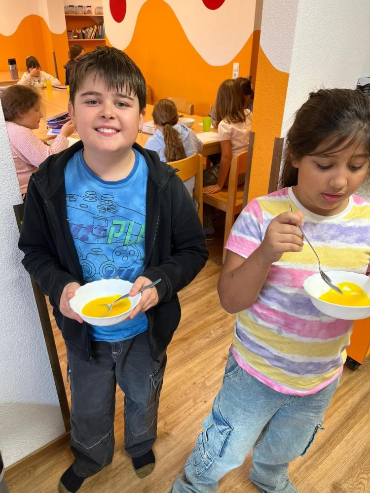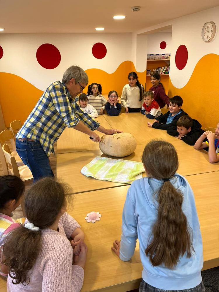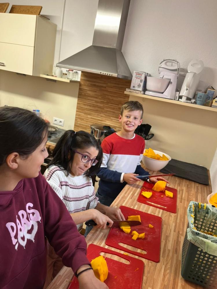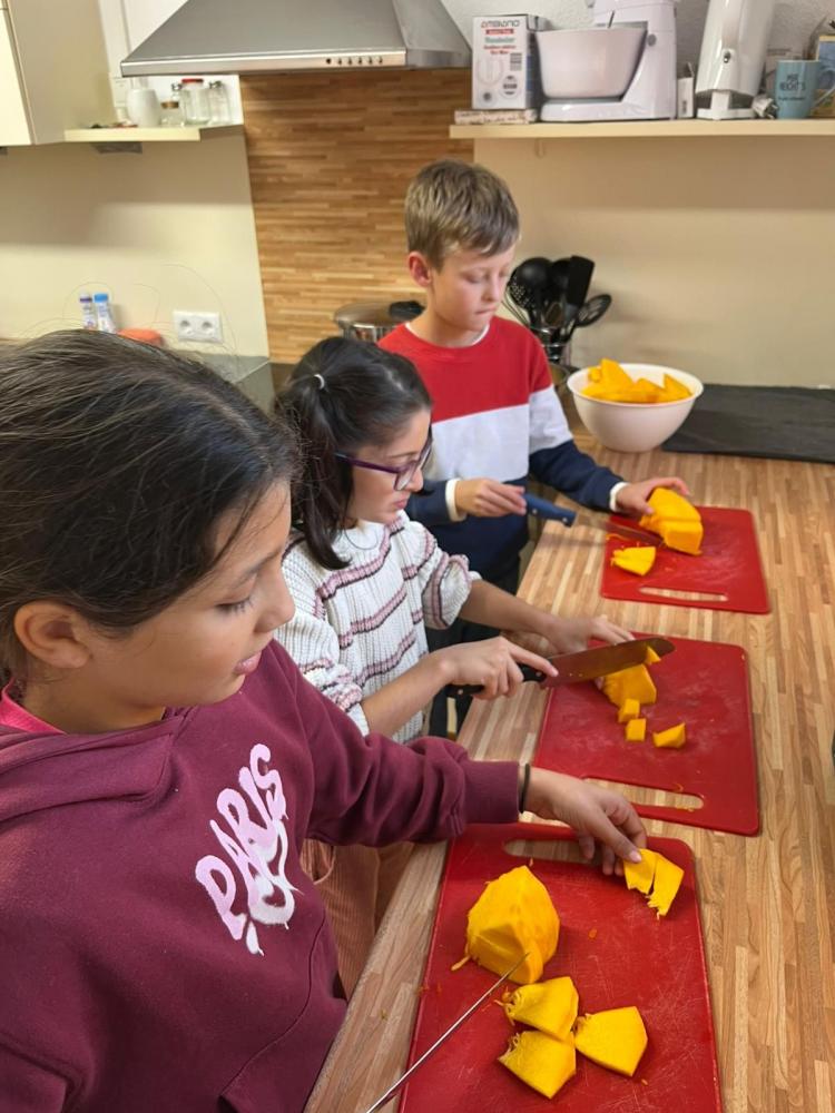 Köstliche Kürbiscremesuppe wird von den Kindern der 4a zubereitet. Davor gilt es den riesengroßen Kürbis auseinanderzuschneiden - dazu muss unser Direktor mit ganzer Kraft Hand anlegen. Der ganze Aufwand lohnt sich für alle: Ein voller Topf mit wohlschmeckender Suppe, die noch fein garniert und miteinander verzehrt wird!