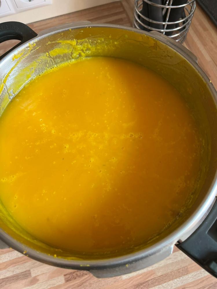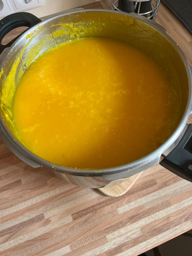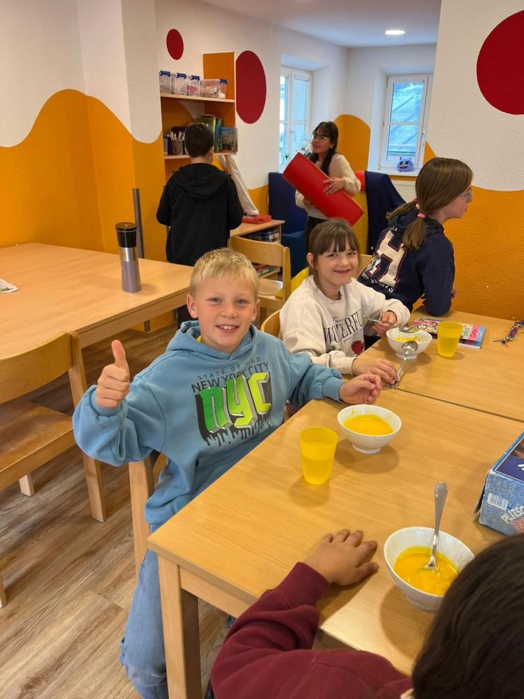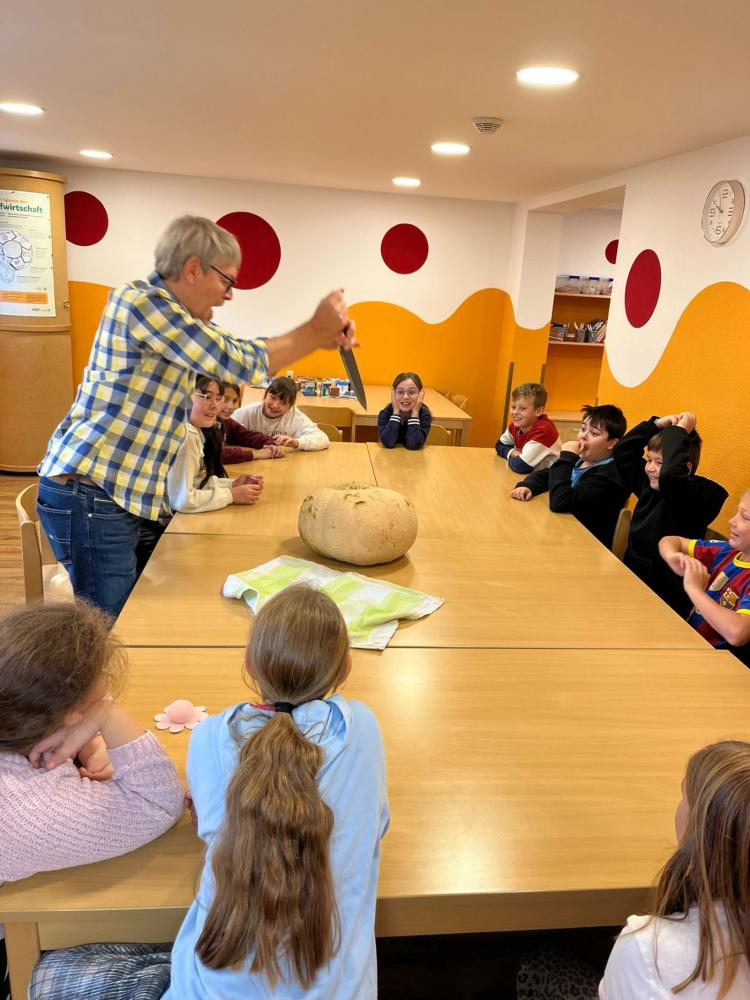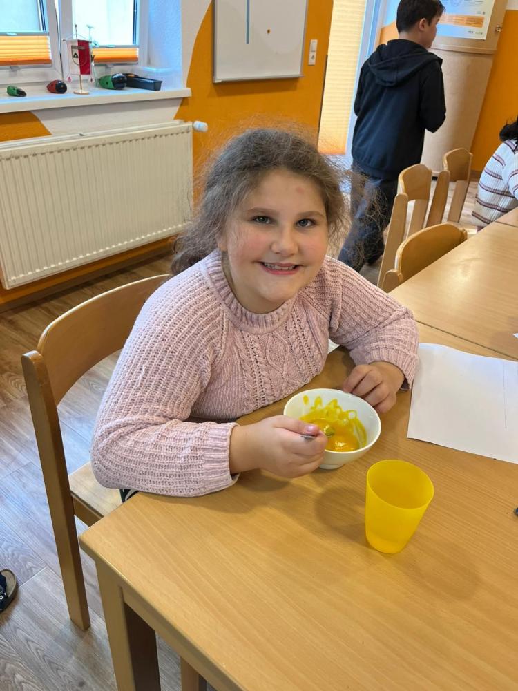 Köstliche Kürbiscremesuppe wird von den Kindern der 4a zubereitet. Davor gilt es den riesengroßen Kürbis auseinanderzuschneiden - dazu muss unser Direktor mit ganzer Kraft Hand anlegen. Der ganze Aufwand lohnt sich für alle: Ein voller Topf mit wohlschmeckender Suppe, die noch fein garniert und miteinander verzehrt wird!