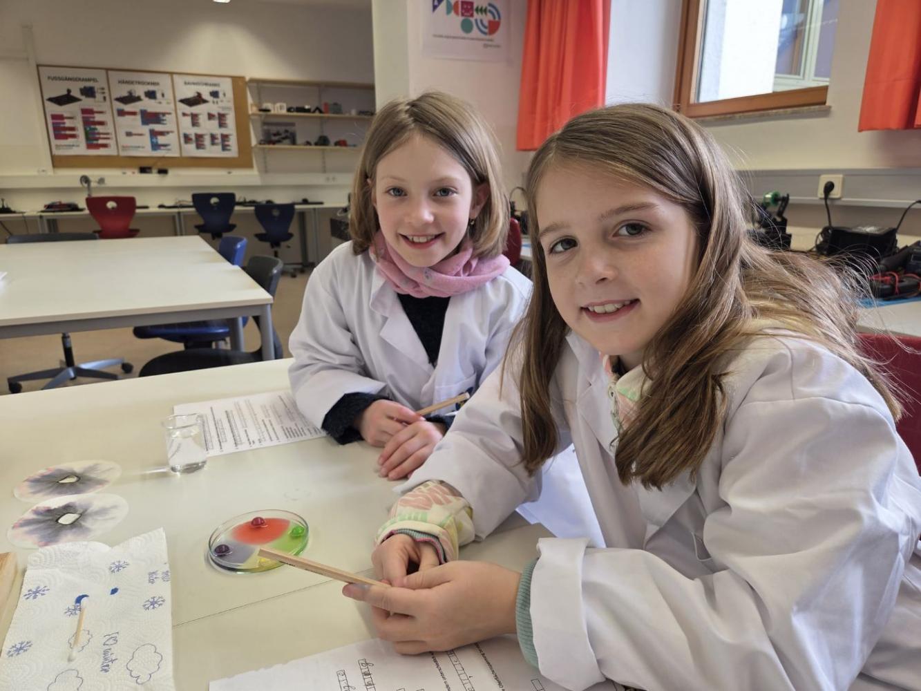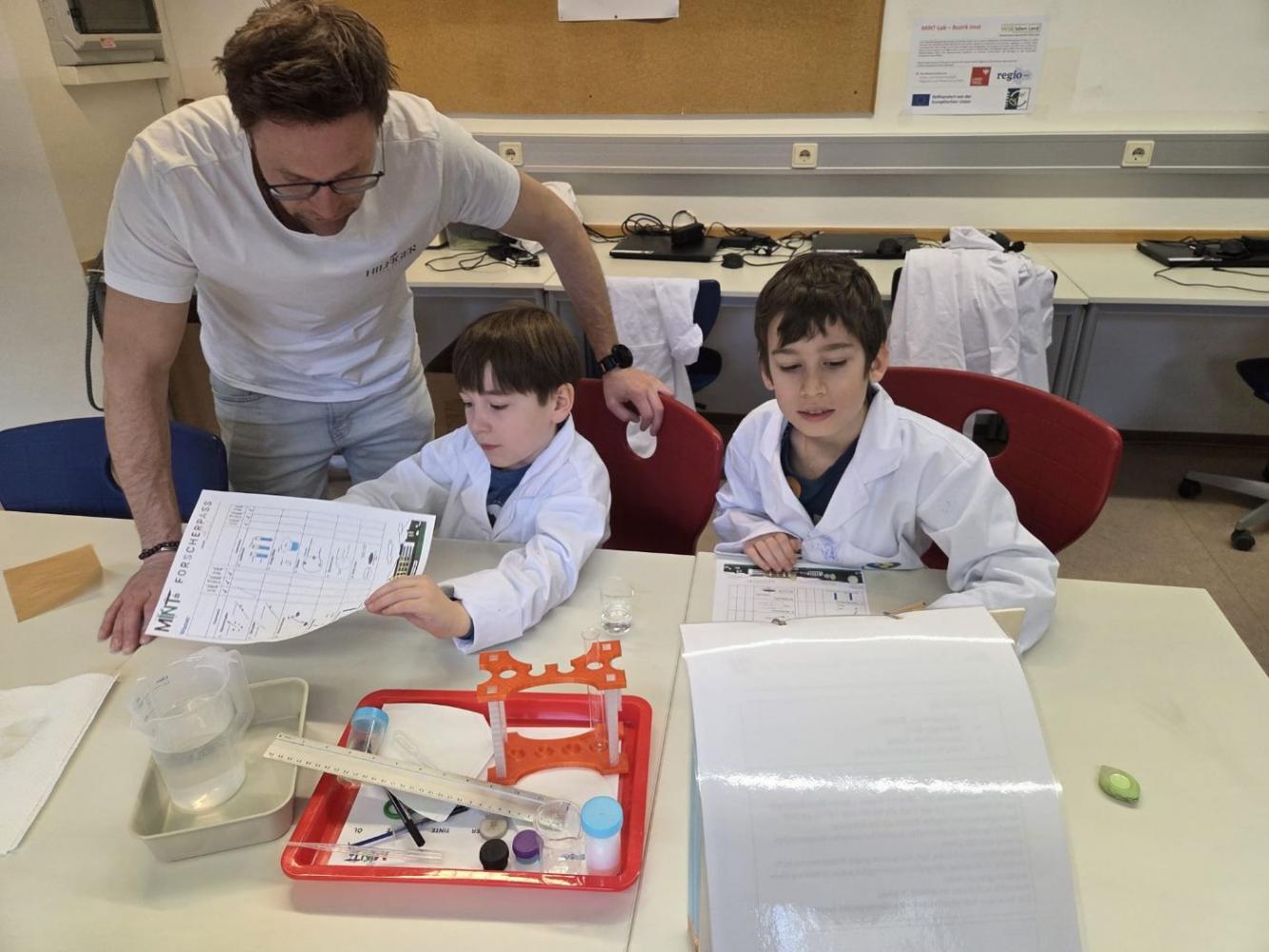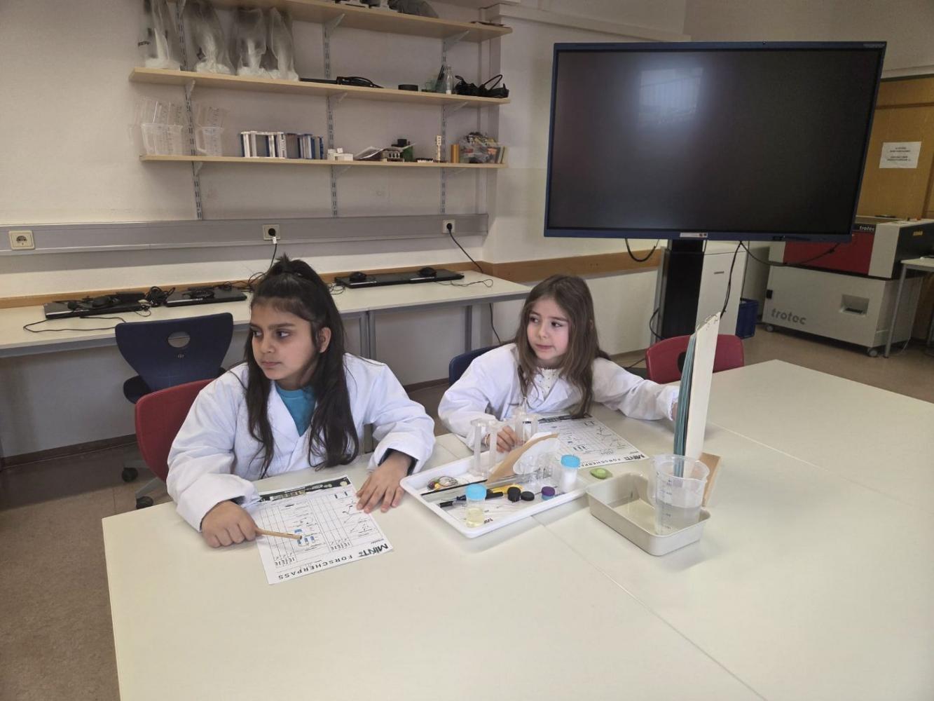 Junge Forscher in weißen Kitteln im MINT-Labor