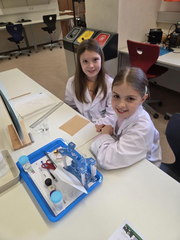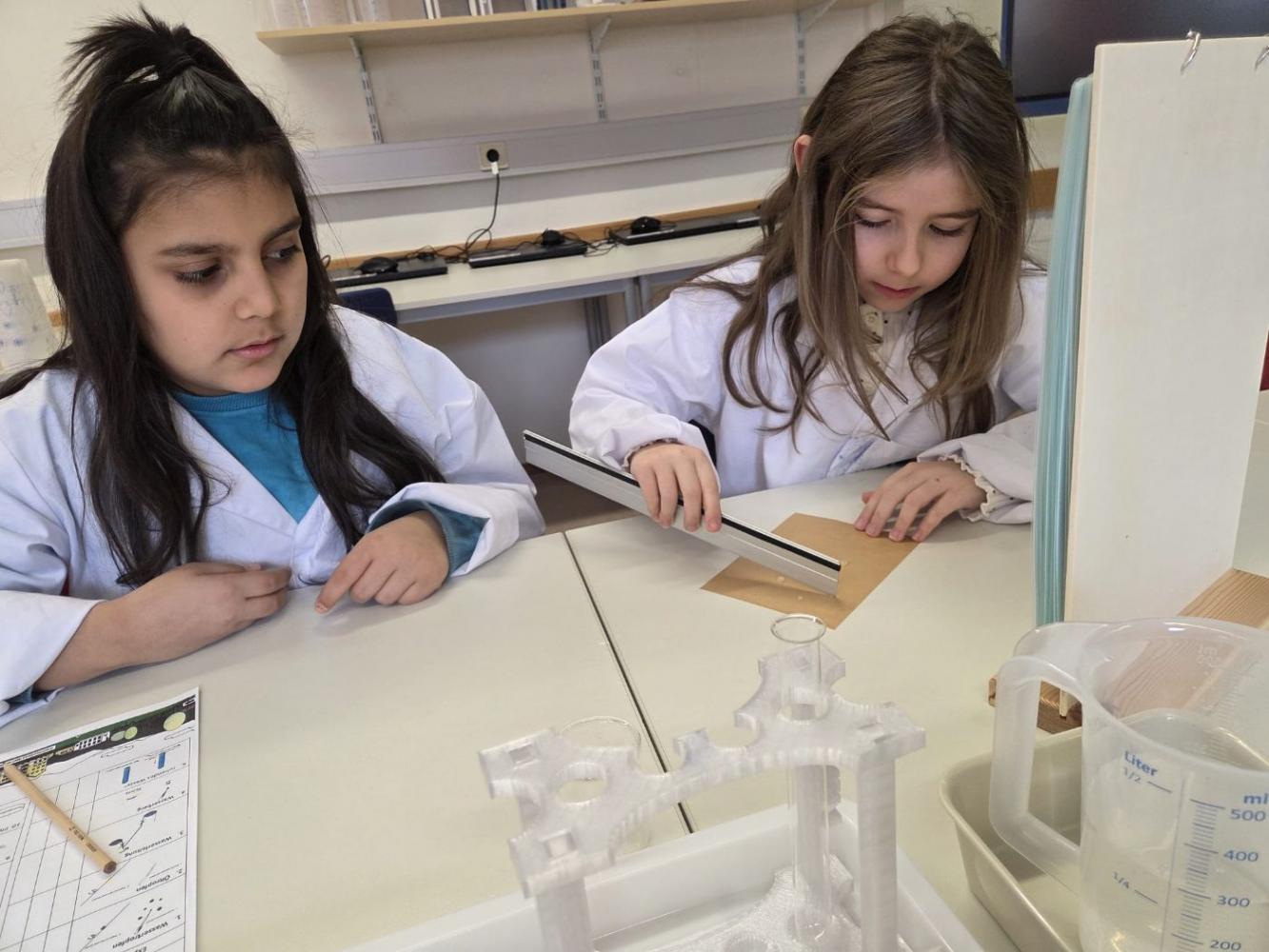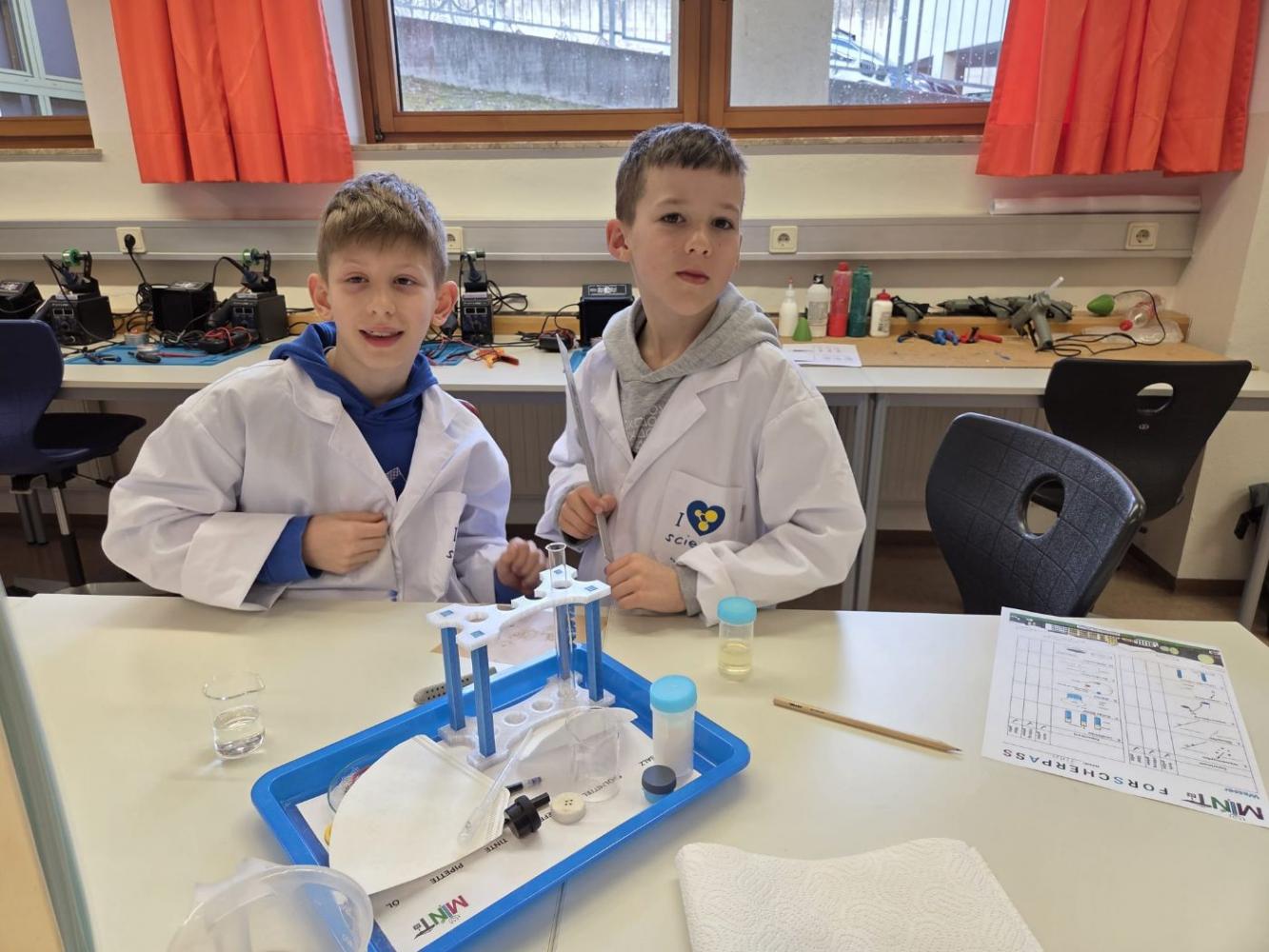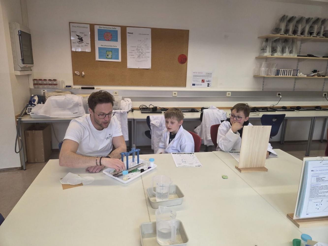 Junge Forscher in weißen Kitteln im MINT-Labor