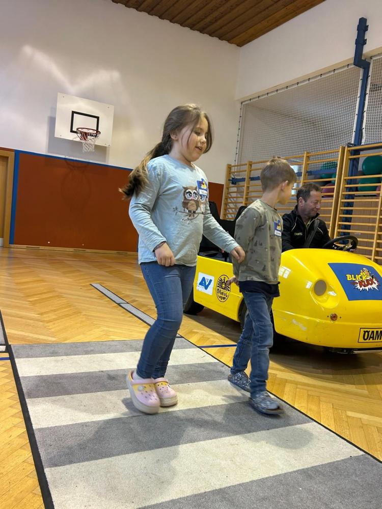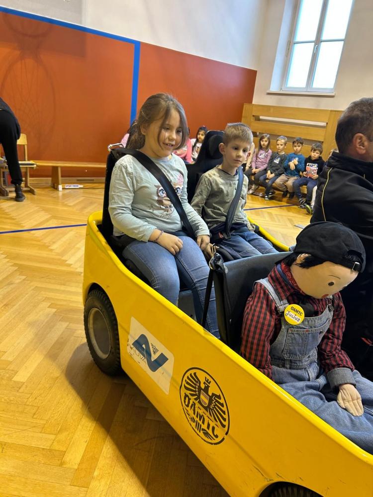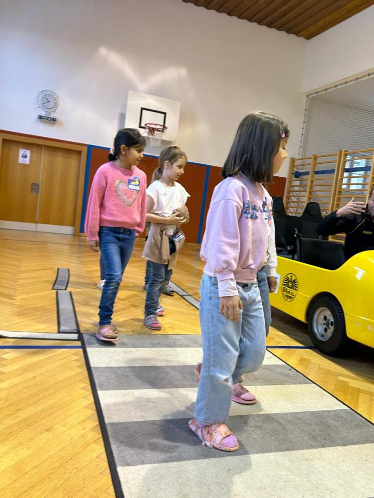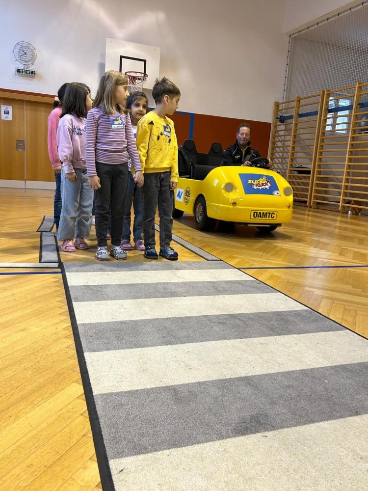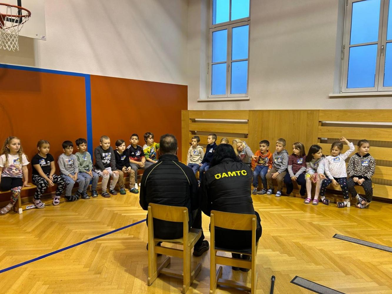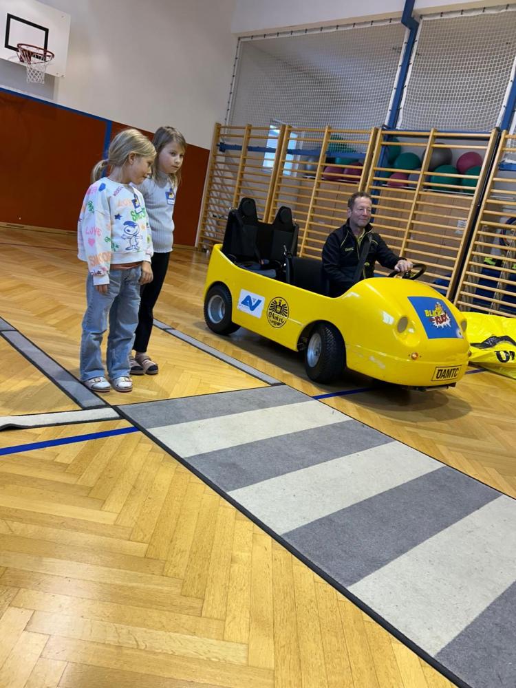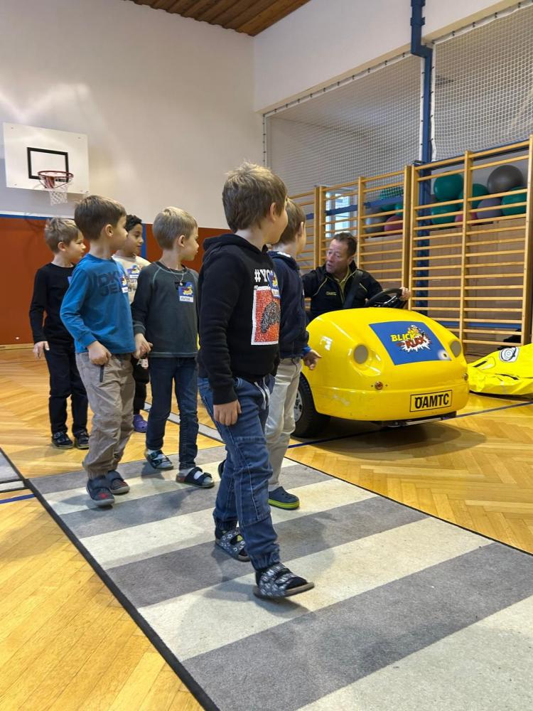 Unsere Ersterler wissen es besser und sind jetzt ausgebildete Straßenverkehr-Profis. Haben sie doch beim spektakulären Verkehrssicherheitsprogramm des ÖAMTC "Blick & Klick" teilgenommen. In unserem Turnsaal wird u.a das richtige Verhalten am Gehsteig und das sichere Überqueren der Straße trainiert. Und in einem quietschenden Elektroauto wird die Notwendigkeit des Sicherheitsgurtes und des Kindersitzes gezeigt und ausprobiert.