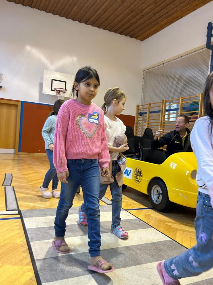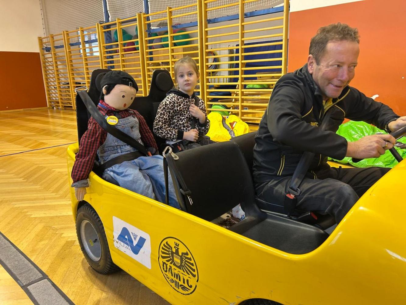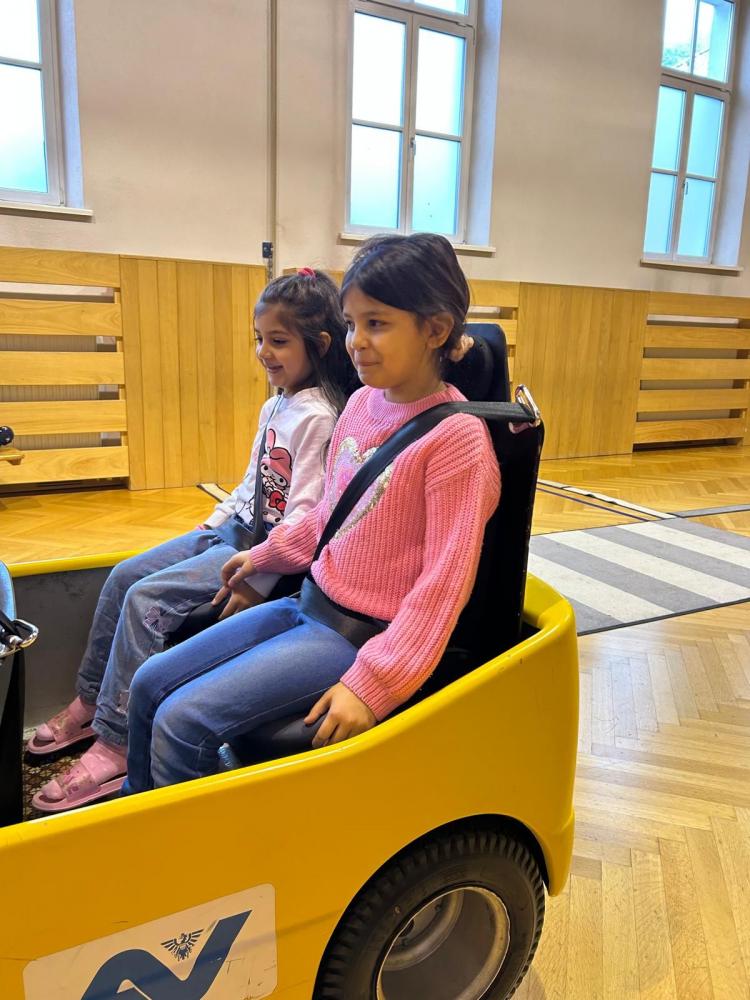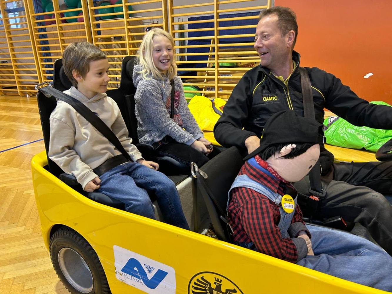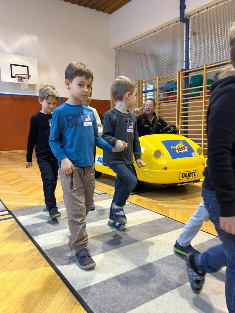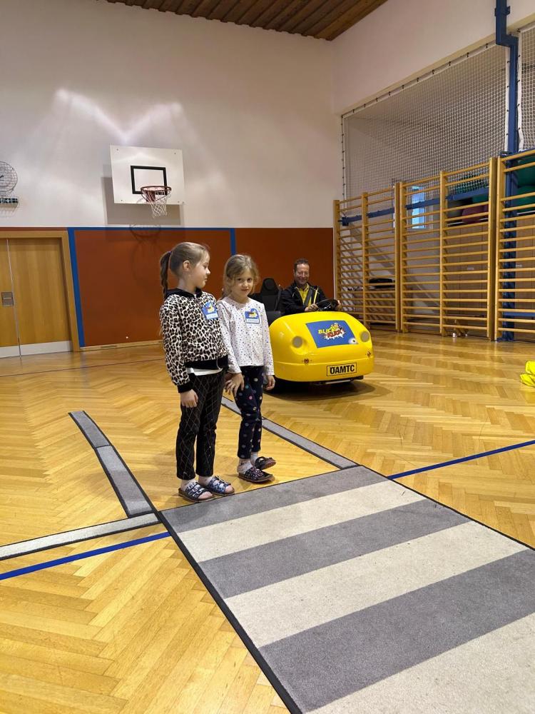 Unsere Ersterler wissen es besser und sind jetzt ausgebildete Straßenverkehr-Profis. Haben sie doch beim spektakulären Verkehrssicherheitsprogramm des ÖAMTC "Blick & Klick" teilgenommen. In unserem Turnsaal wird u.a das richtige Verhalten am Gehsteig und das sichere Überqueren der Straße trainiert. Und in einem quietschenden Elektroauto wird die Notwendigkeit des Sicherheitsgurtes und des Kindersitzes gezeigt und ausprobiert.
