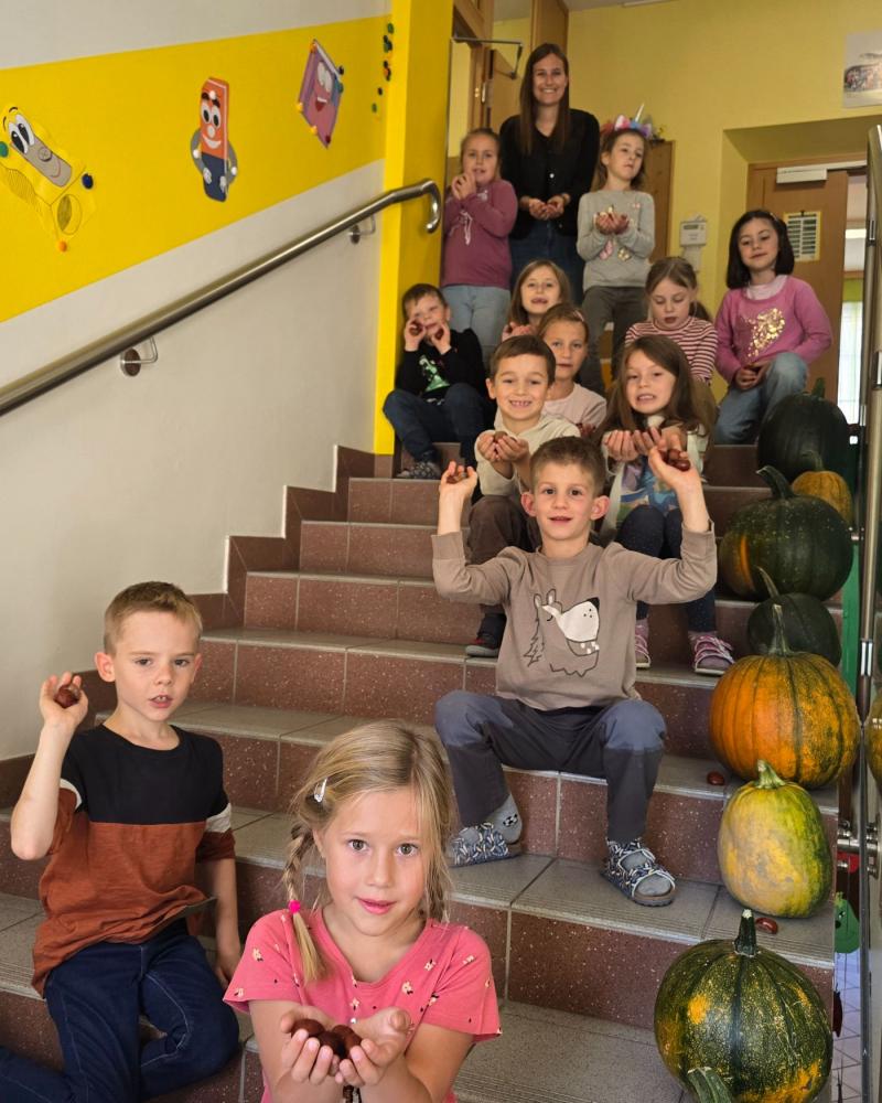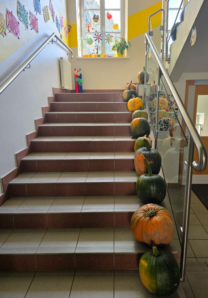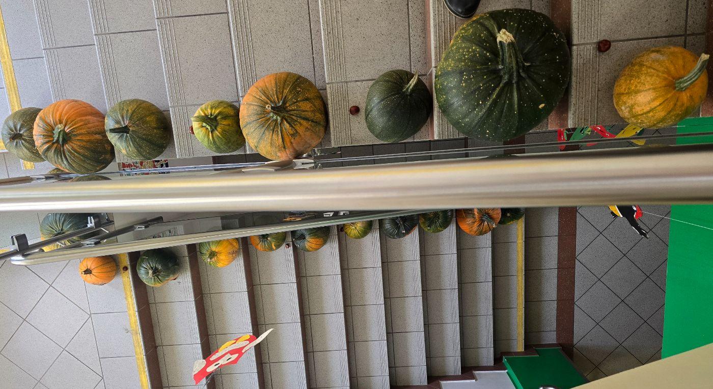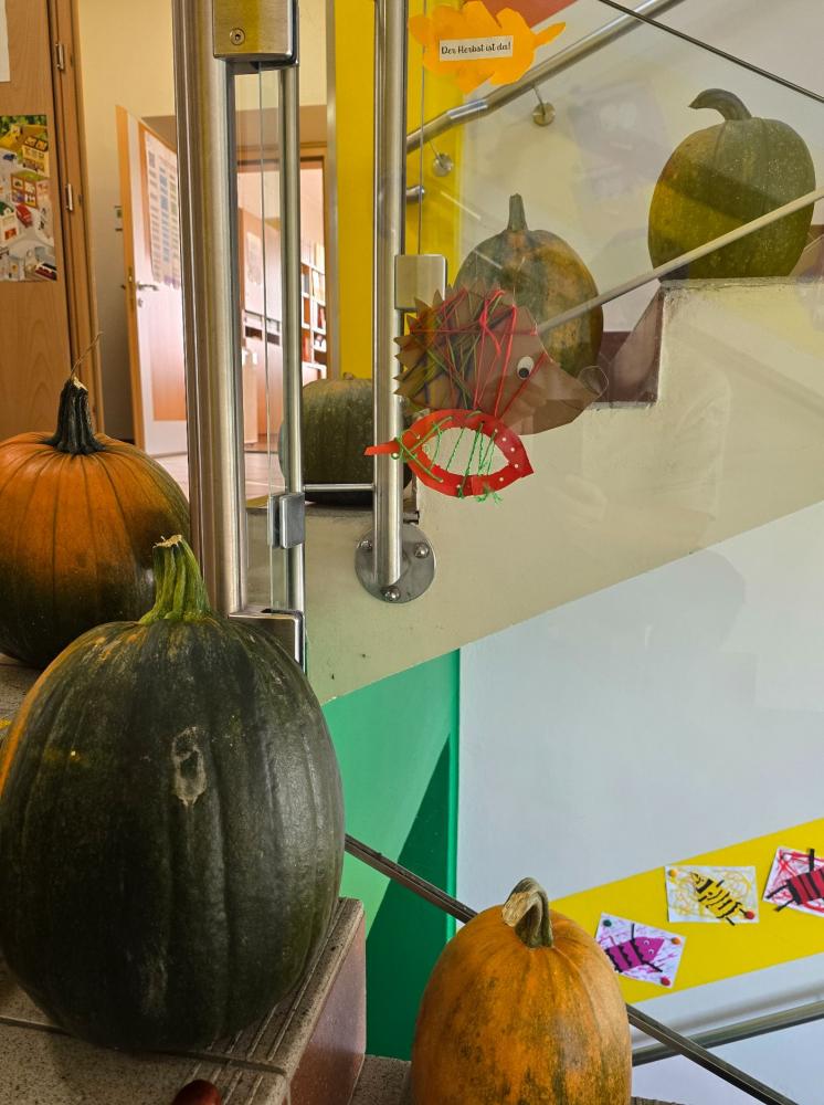 Über 30 riesengroße Kürbisse spendierte uns dankenswerterweise Dominik vom Melmerhof in See-Eck. Diese "Plutzer" wurden von den Kindern im Stiegenhaus platziert und von der 1a Klasse zudem noch mit Kastanien flankiert.