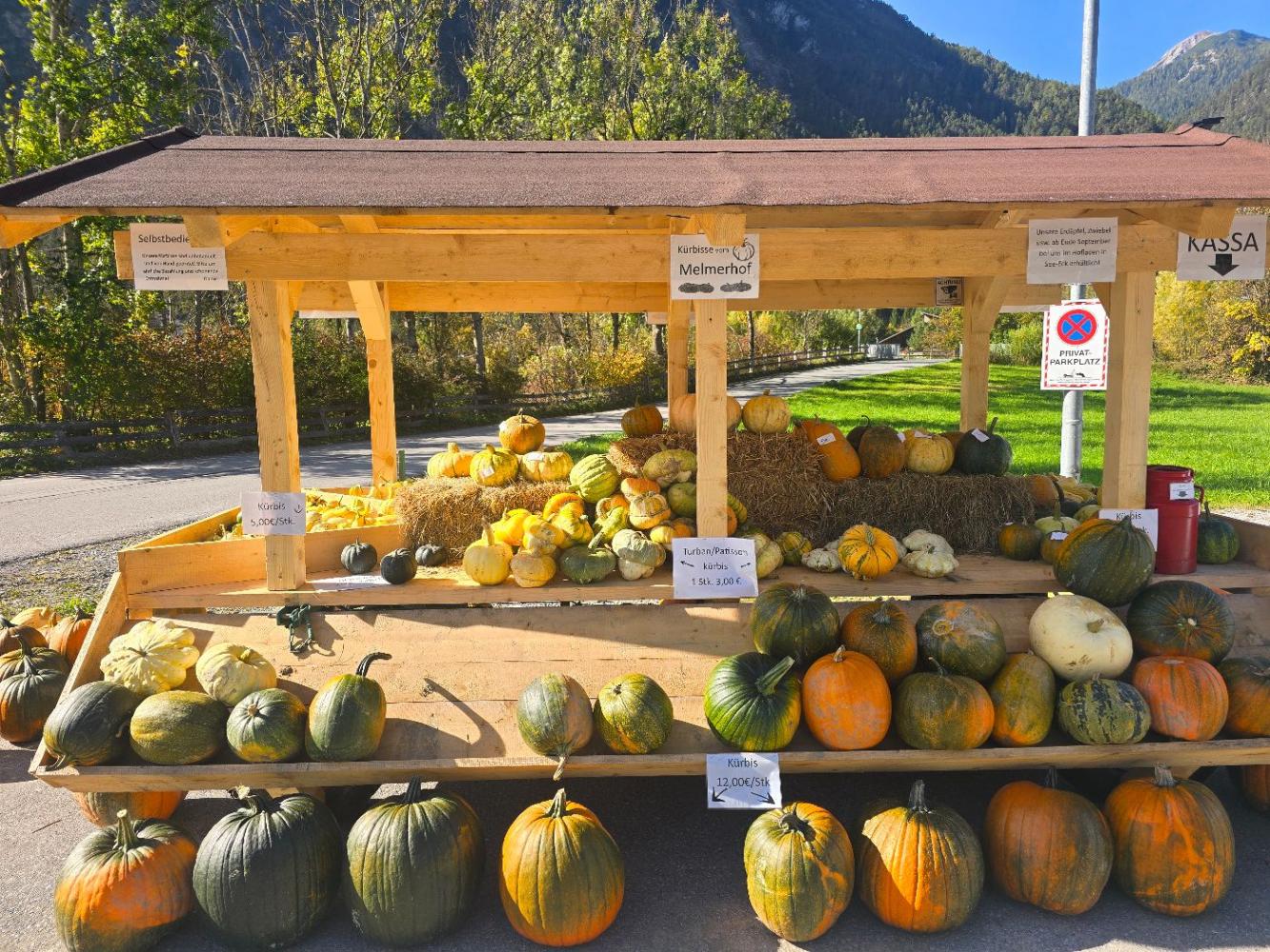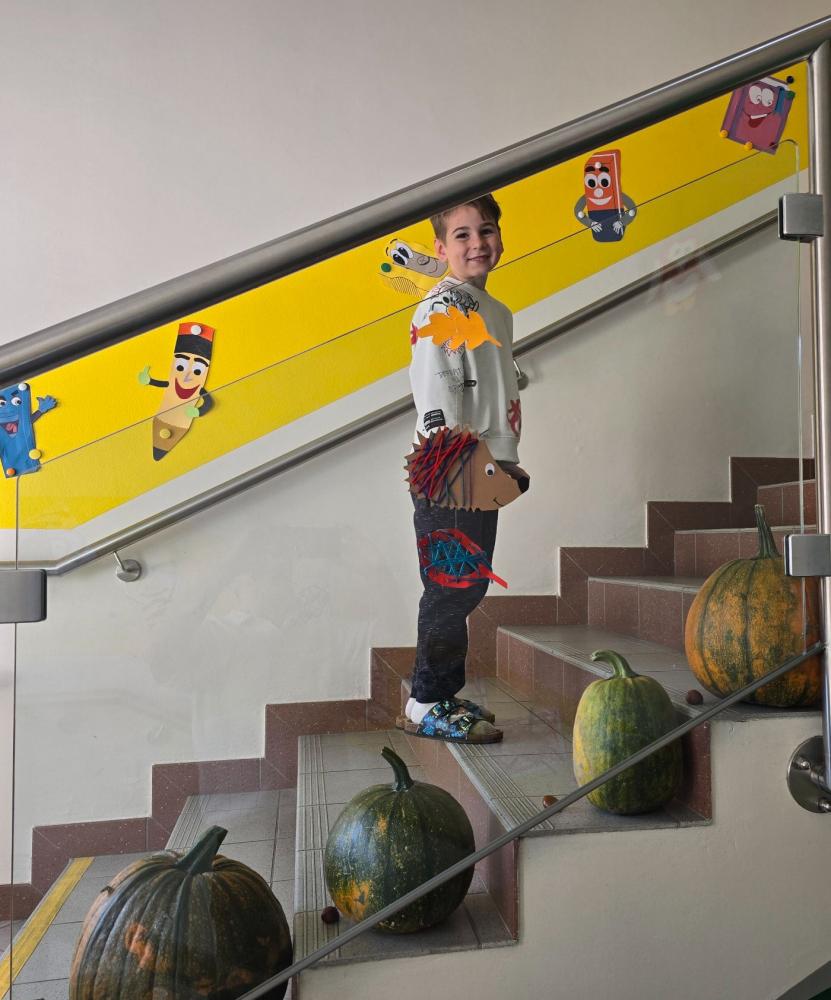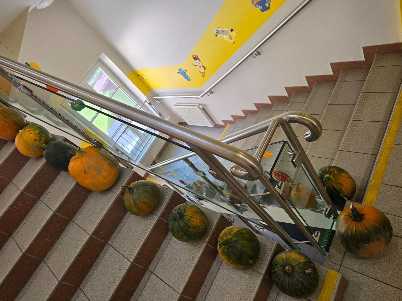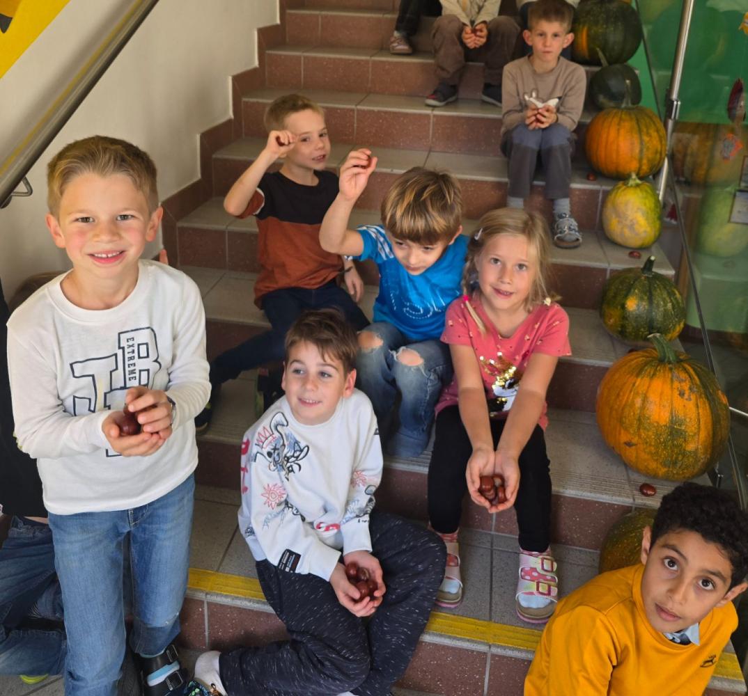 Über 30 riesengroße Kürbisse spendierte uns dankenswerterweise Dominik vom Melmerhof in See-Eck. Diese "Plutzer" wurden von den Kindern im Stiegenhaus platziert und von der 1a Klasse zudem noch mit Kastanien flankiert.