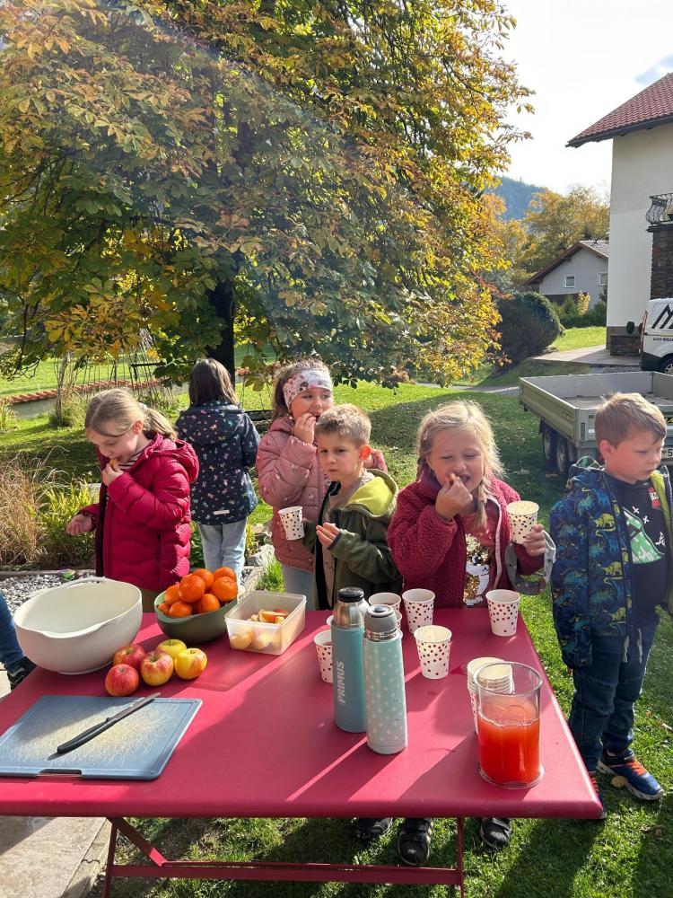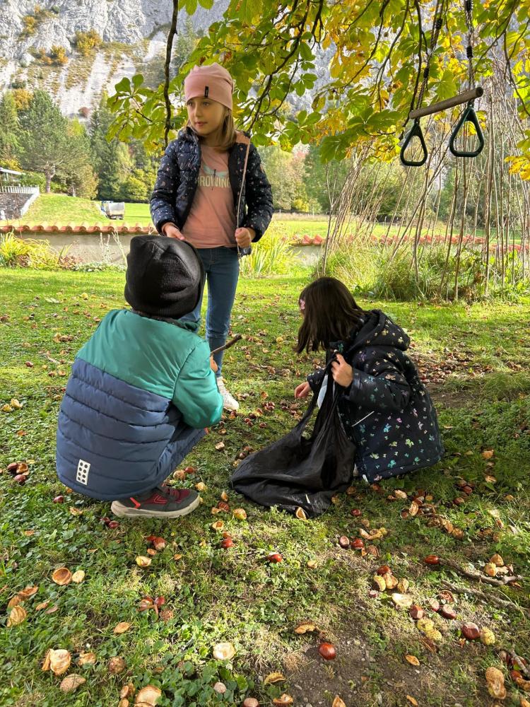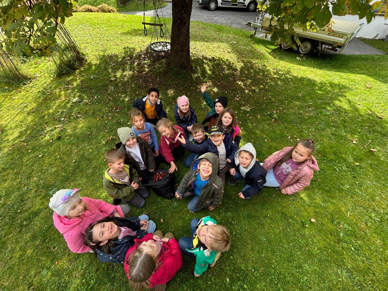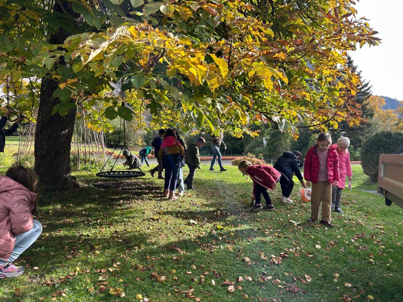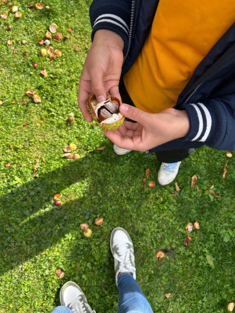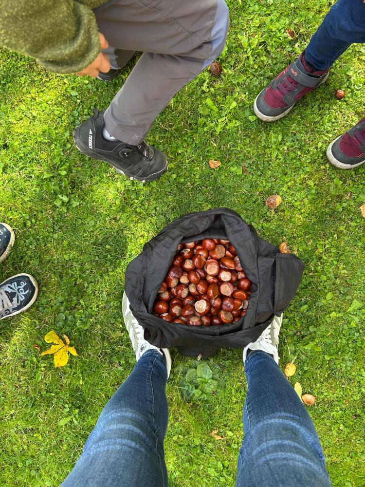 Charlotte aus der 1a lud nämlich ihre Mitschüler zum Kastaniensammeln ein, in sämtliche Taschen stopfte jeder sooo viele Kastanien `rein. Und Apfelschnitten und Saft gab´s noch dazu.